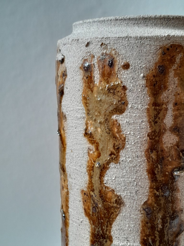 Alice skickade några små prover som finns att beses för den nyfikne, se inläggets översta bild. Den orangea vasen är 100% södermöjalera, ofiltrerad och bränd till 900°C. Den vita vasen till höger är gjord på vanlig vitlera, men den flammiga bruna ytan är en glasyr gjord på 50% träaska och 50% södermöjalera, bränd till 1240°C.